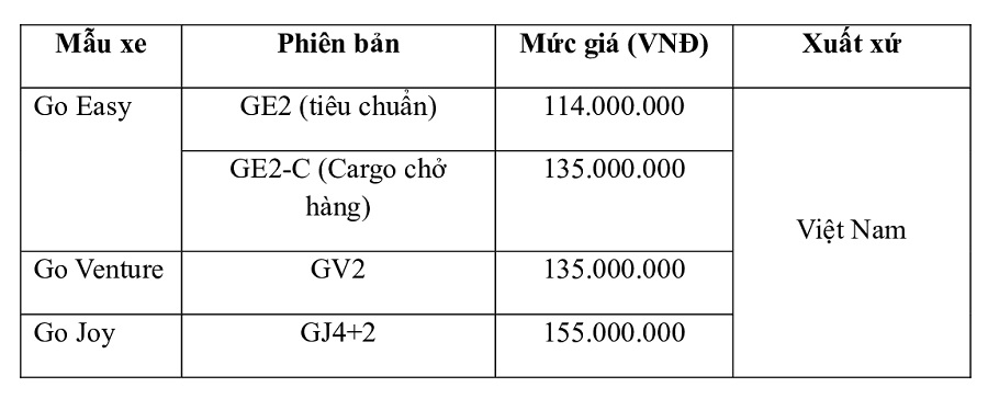 Go Easy là “tân binh” nhỏ gọn nhất, dành riêng cho sân golf và khu nghỉ dưỡng. Phiên bản 2 chỗ (có thể nâng cấp lên 4 chỗ) sử dụng động cơ AC 4kW kết hợp pin Lithium Iron Phosphate (LFP) cao cấp, cho quãng đường di chuyển 50-80 km sau mỗi lần sạc đầy. Xe nhẹ nhàng, dễ xoay sở trên địa hình phẳng, phù hợp làm phương tiện đưa đón khách hoặc xe tuần tra nội khu. Giá khởi điểm chỉ từ 114 triệu đồng cho bản tiêu chuẩn GE2, còn bản chở hàng GE2-C là 135 triệu đồng.