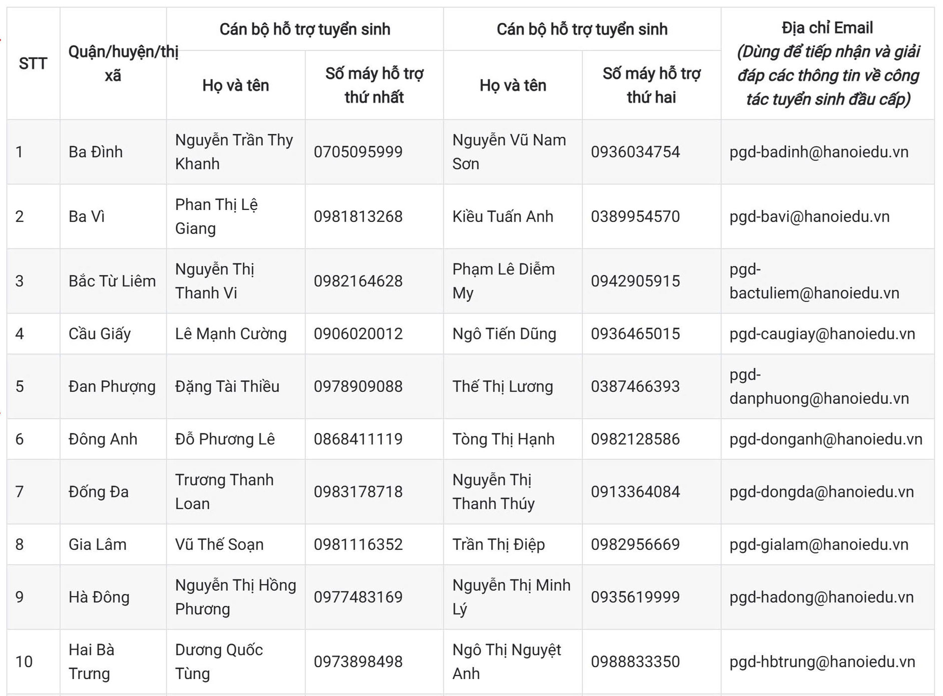 Dưới đây là danh sách các số điện thoại hỗ trợ tuyển sinh đầu cấp của 30 quận, huyện, thị xã: