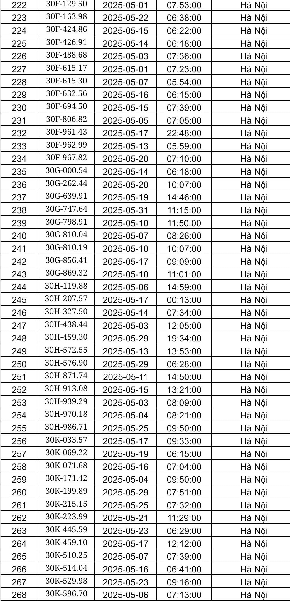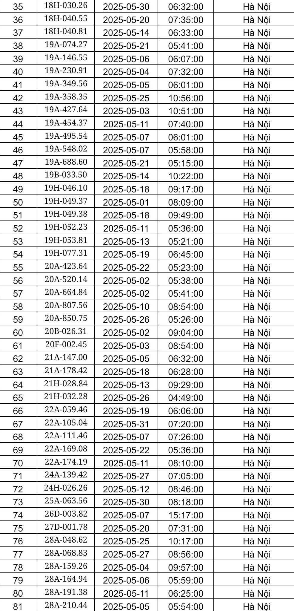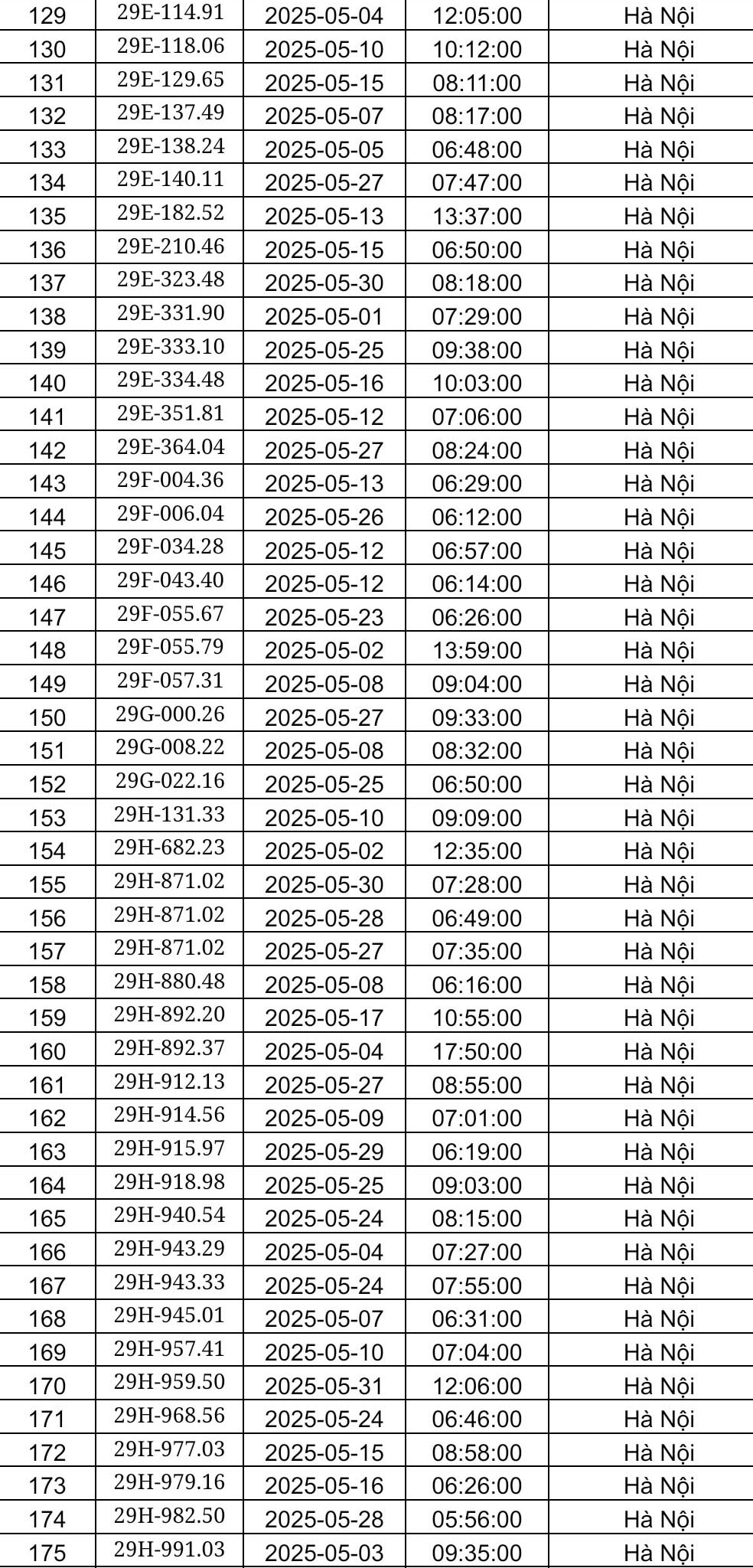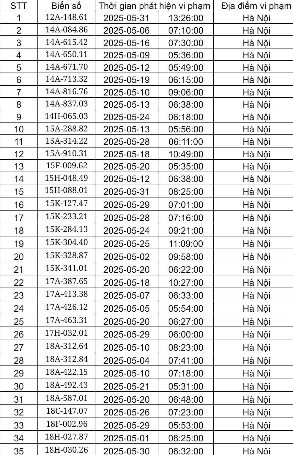 Cụ thể, ngày 11/6 Phòng Cảnh sát giao thông, Công an TP. Hà Nội vừa thông báo danh sách phương tiện ô tô vi phạm trật tự an toàn giao thông trong tháng Năm (từ ngày 1/5 đến 31/5/2025), được phát hiện qua hệ thống giám sát.