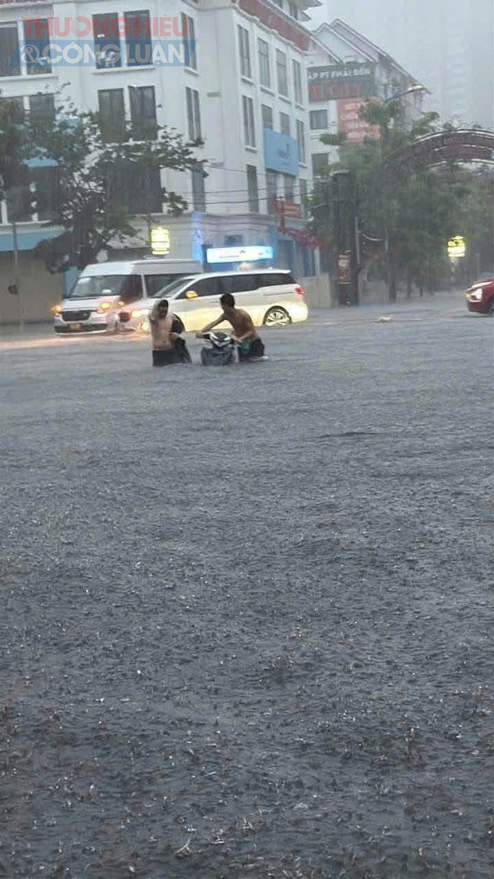 Từ rạng sáng 26/8, nhiều tuyến phố trung tâm đều bị ngập sâu. Nhiều đoạn đường nước dâng ngang đầu gối, hàng chục xe máy phải dắt bộ, nhiều người buộc phải quay đầu tìm lối khác.