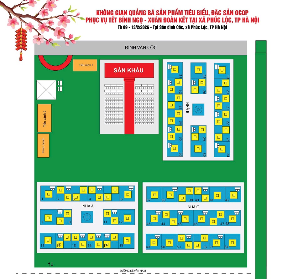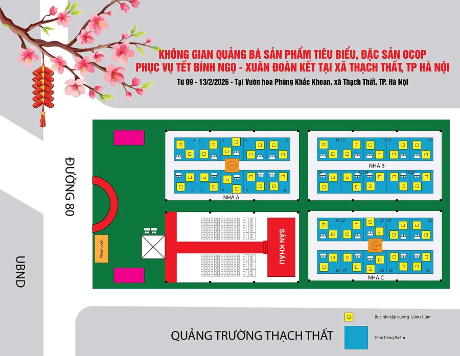 Trong khi đó, tại xã Thạch Thất, không gian quảng bá được bố trí tại vườn hoa Phùng Khắc Khoan với gần 100 gian hàng, khai mạc từ 17h00 đến 18h30 ngày 9/2.