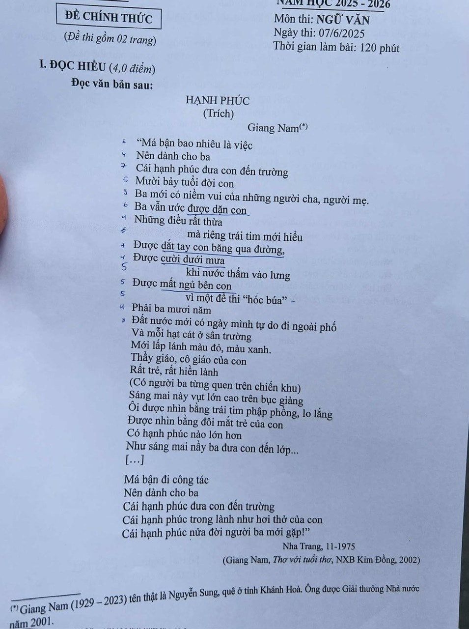 Theo đánh giá, tại phần đọc hiểu, Việt Nam vừa có chuỗi hoạt động kỷ niệm 50 năm ngày thống nhất đất nước với những câu chuyện lịch sử, hình ảnh cuộc chiến được tái hiện đầy hào hùng nên có lẽ, khi xuất hiện trích đoạn trong bài thơ "Hạnh phúc" của Giang Nam, những câu thơ: "Phải ba mươi năm/Đất nước mới có ngày mình tự do đi ngoài phố"... cũng tạo được nhiều cảm xúc cho thí sinh.