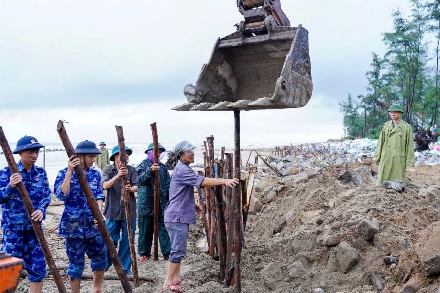 Dưới thời tiết mưa gió, các lực lượng và nhân dân xã Đan Hải khẩn trương vận chuyển bao tải chứa cát, đá hộc, rọ thép, cọc, cùng các phương tiện, máy móc để gia cố tại các vị trí xung yếu.