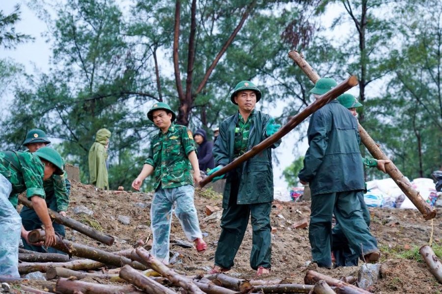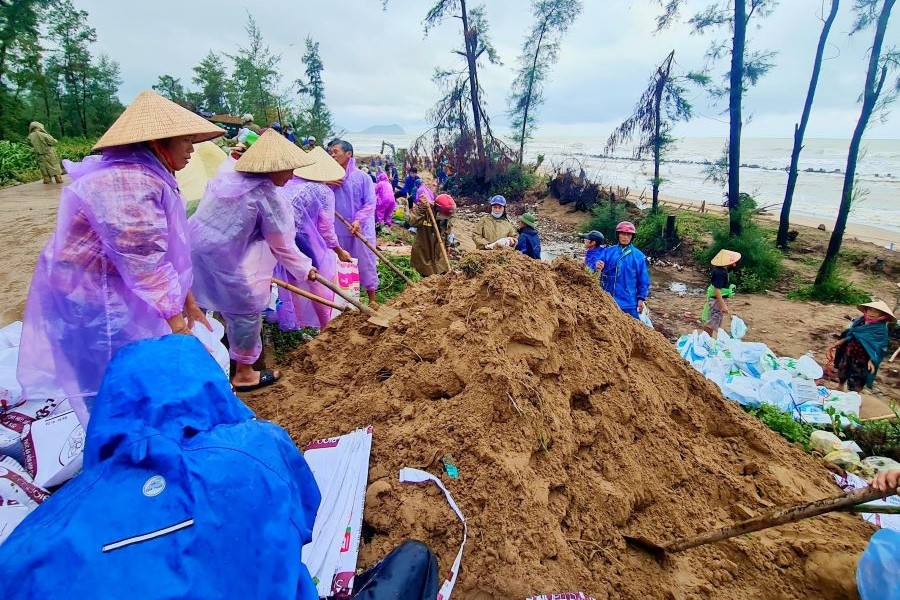 Sáng 27/9, xã Đan Hải đã huy động hàng trăm người thuộc các lực lượng quân đội, công an, cảnh sát biển, dân quân tự vệ, đoàn viên thanh niên và người dân khẩn trương gia cố tuyến đê Hội Thống.