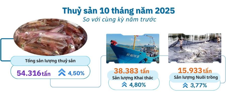 Tính chung 10 tháng năm 2025, tổng sản lượng thủy hải sản khai thác và nuôi trồng ước đạt 54.316 tấn, bằng 104,50% (tăng 2.338 tấn) so với cùng kỳ năm trước. Trong đó, sản lượng khai thác ước đạt 38.383 tấn, bằng 104,80% (tăng 1.759 tấn) và sản lượng nuôi trồng ước đạt 15.933 tấn, bằng 103,77% (tăng 579 tấn) so với cùng kỳ năm trước.
