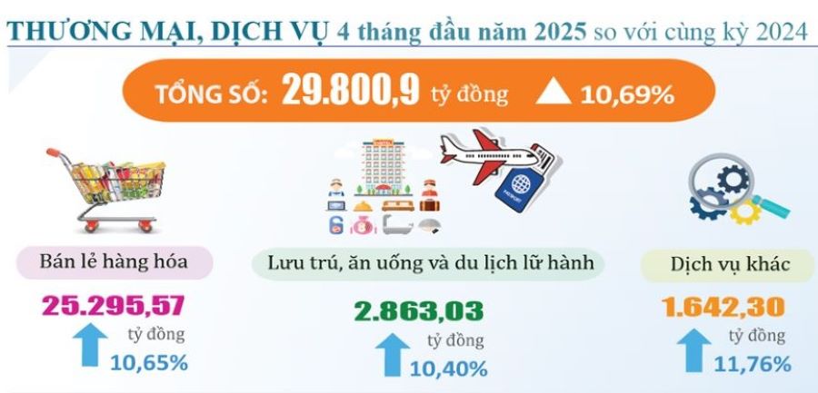 Doanh thu bán lẻ hàng hóa trong tháng 4 ước đạt 6.324,22 tỷ đồng, tăng 2,84% so với tháng trước và tăng 12,0% so với cùng kỳ năm trước. Tính chung 4 tháng đầu năm 2025, tổng mức bán lẻ hàng hóa ước đạt 25.295,57 tỷ đồng, tăng 10,65% so với cùng kỳ năm trước.
