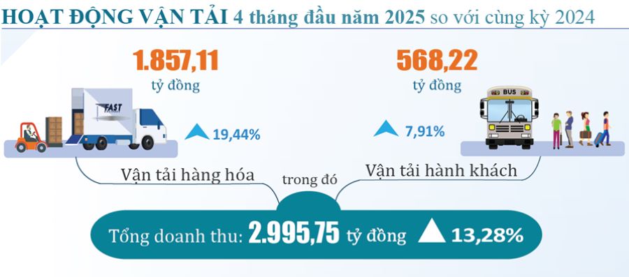 Trong 4 tháng đầu năm 2025, tổng doanh thu vận tải đạt 2.995,75 tỷ đồng, tăng 13,28% so với cùng kỳ năm 2024, trong đó: Vận tải hành khách đạt 568,22 tỷ đồng, tăng 7,91% so với cùng kỳ năm trước; vận tải hàng hóa đạt 1.857,11 tỷ đồng, tăng 19,44% so với cùng kỳ năm trước; doanh thu kho bãi, dịch vụ hỗ trợ vận tải ước đạt 546,40 tỷ đồng, tăng 0,64% so với cùng kỳ năm trước.