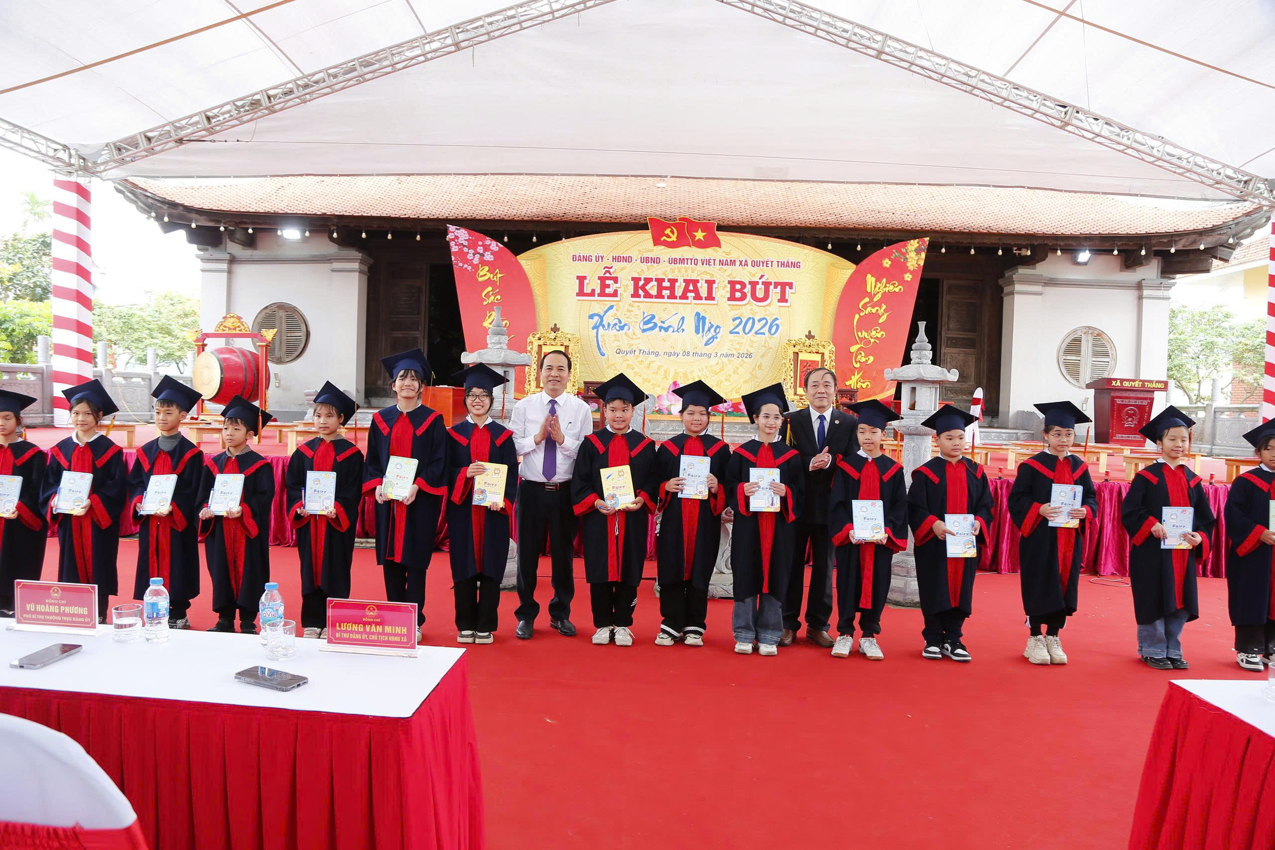 Tại buổi lễ, các đồng chí lãnh đạo xã cùng các thầy cô giáo và các em học sinh đã thực hiện nghi thức khai bút thiêng liêng. Những nét chữ rồng bay phượng múa không chỉ thể hiện sự khéo léo mà còn thể hiện quyết tâm thực hiện thắng lợi các nhiệm vụ chính trị, kinh tế - xã hội của địa phương trong năm 2026.