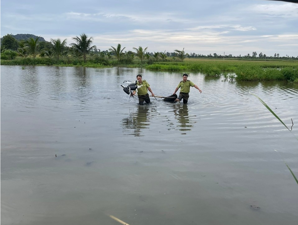 Nhận được thông tin của người dân, ngày 23/10/2025, Hạt Kiểm lâm khu vực III phối hợp với Tổ công tác Chi cục Kiểm lâm Vùng I và Đại diện chính quyền phường Bạch Đằng, TP. Hải Phòng đã tiến hành kiểm tra hiện trường một số vị trí đặt lưới bẫy, săn bắt chim hoang dã di cư trái pháp luật. Tại vị trí kiểm tra là khu vực cánh đồng lúa, bãi chăn thả, khu phố 3, phường Bạch Đằng phát hiện trên diện tích bãi chăn thả có nhiều cọc tre, lưới cước màu đen bẫy chim đã được giăng theo từng dải, dài khoảng 1500 m và 15 con chim giả bằng xốp dùng để dụ bẫy chim.