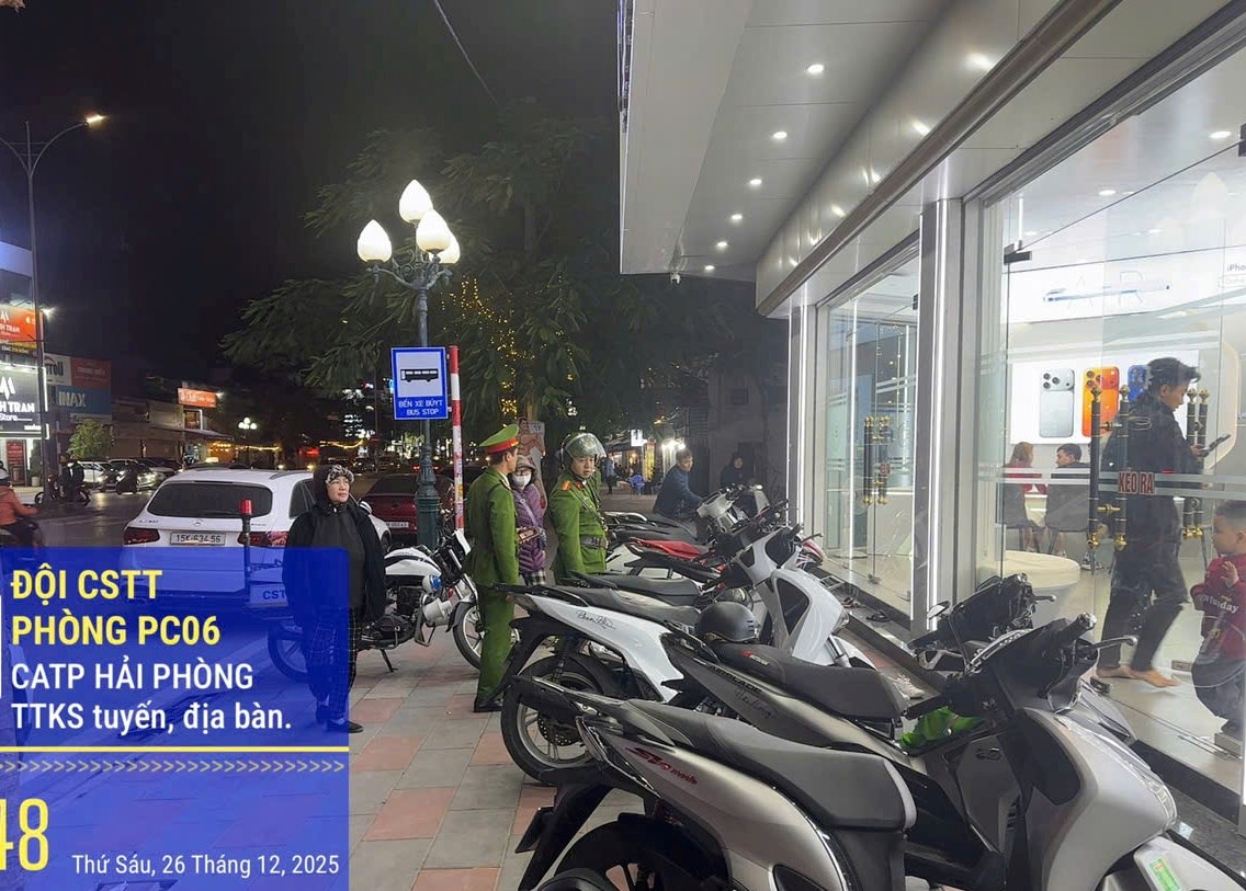 Cũng trong đêm 26/12/2025, Đội Cảnh sát trật tự - Phòng Cảnh sát Quản lý hành chính về trật tự xã hội đã phân công lực lượng tuần tra kiểm soát tại tuyến đường Hồ Sen, Bùi Viện, Lạch Tray. Qua đó, đơn vị xử lý 05 trường hợp xe mô tô vi phạm (để xe ở lòng đường trái phép), yêu cầu 21 hộ kinh doanh ký cam kết không lấn chiếm vỉa hè, lòng đường kinh doanh buôn bán và ăn uống làm nơi tụ tập thanh niên ăn uống tại tuyến Hồ Sen.