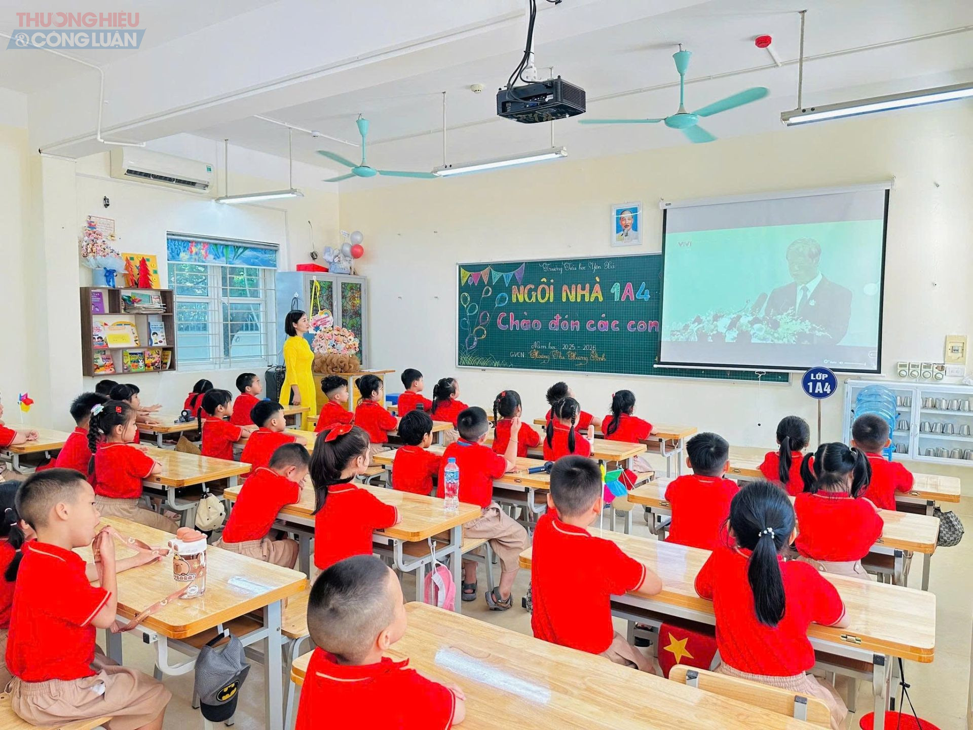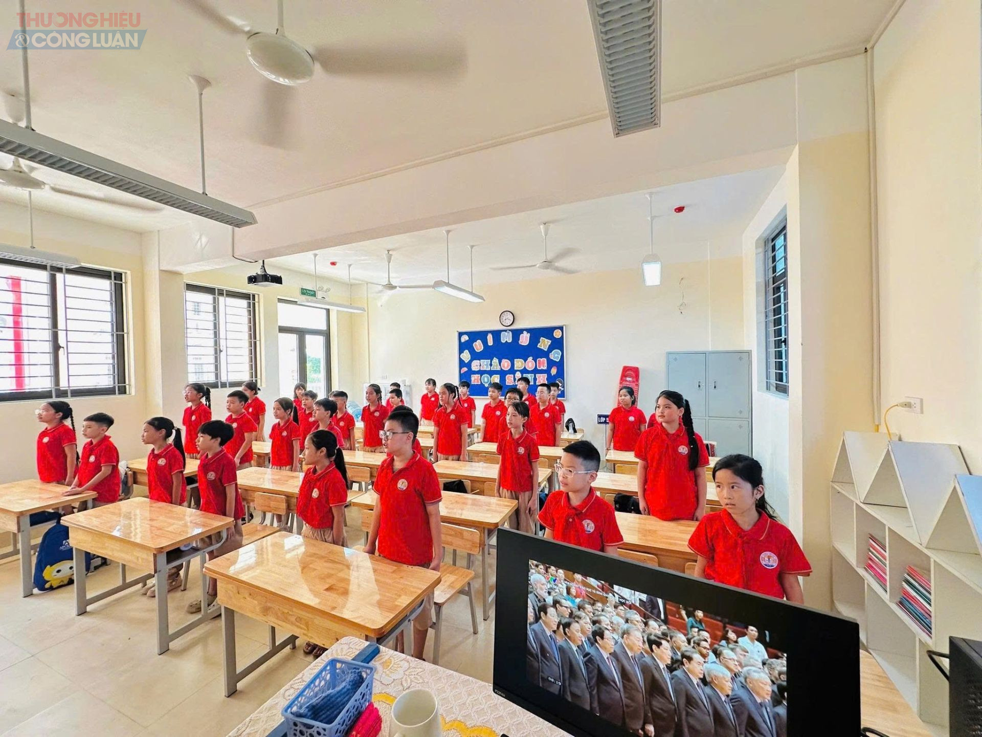 Đúng 8h00, các cô giáo và học sinh bắt đầu tham dự đầy đủ các nội dung theo chương trình do Bộ GD-ĐT tổ chức. Trong đó, thực hiện nghi thức chào cờ, hát Quốc ca cùng thời điểm diễn ra lễ chào cờ tại Trung tâm Hội nghị Quốc gia; nghe phát biểu của Tổng Bí thư Tô Lâm...