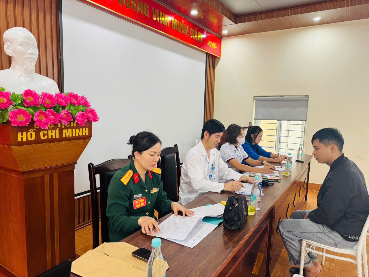 Có mặt tại khu vực khám tuyển, chúng tôi chứng kiến không khí làm việc sôi nổi, khẩn trương, nghiêm túc. Công tác đón tiếp, hướng dẫn, phân luồng được thực hiện nghiêm túc, nhanh gọn, an toàn và đúng quy trình, các vị trí khám được bố trí khoa học, thuận tiện. Các thanh niên đều có ý thức chấp hành tốt, đến đúng giờ, trang phục gọn gàng, tinh thần phấn khởi, thể hiện trách nhiệm đối với Tổ quốc. Các y bác sĩ của Hội đồng khám tuyển làm việc tận tình, khách quan, đúng chuyên môn. Mỗi điểm khám đều có cán bộ Ban chỉ huy phòng thủ khu vực 4, Ban chỉ huy quân sự xã, công an xã hướng dẫn, kiểm tra, theo dõi trong suốt quá trình khám tuyển. Thanh niên đến khám tuyển sức khỏe nghĩa vụ quân sự 2026 được khám thể lực và lâm sàng theo các chỉ tiêu: Mắt, tai mũi họng, răng hàm mặt, thần kinh, tâm thần, nội khoa, ngoại khoa, da liễu. Khám cận lâm sàng như chụp X-quang tim phổi thẳng, siêu âm bụng tổng quát, điện tim, xét nghiệm nhóm máu, sàng lọc HIV, ma túy.
