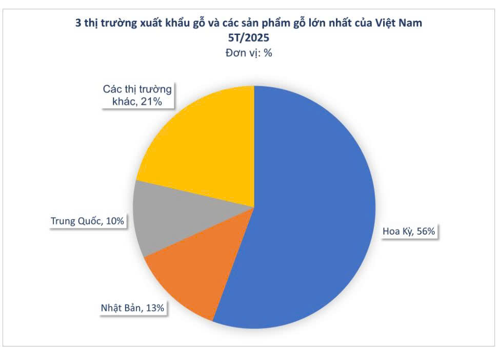 Mỹ tiếp tục là thị trường xuất khẩu lớn nhất của gỗ và sản phẩm gỗ Việt Nam, chiếm tới 55,6% tổng kim ngạch với hơn 3,78 tỷ USD trong 5 tháng, tăng 13,5% so với cùng kỳ. Riêng tháng 5/2025, xuất khẩu sang Mỹ đạt 852,01 triệu USD, tăng 6,6% so với tháng 4 và tăng mạnh 25,9% so với tháng 5/2024. Đáng chú ý, thuế suất đồ gỗ Việt xuất sang Mỹ hiện ở mức 0%.