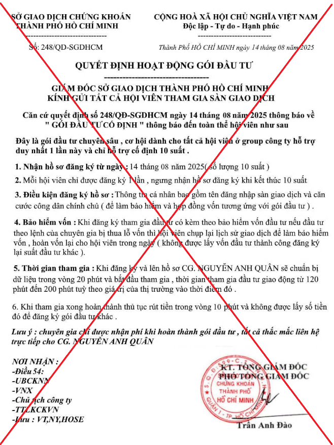Sở khẳng định hình ảnh thông tin trên là không đúng và đã bị giả mạo đồng thời cảnh báo nhà đầu tư cần nâng cao cảnh giác trước các thông tin không xác thực, đặc biệt là các hình ảnh tài liệu mạo danh HoSE như “Quyết định hoạt động gói đầu tư”, “hợp đồng hợp tác đầu tư” các tài liệu, văn bản sử dụng hình ảnh con dấu và chữ ký giả mạo Sở.