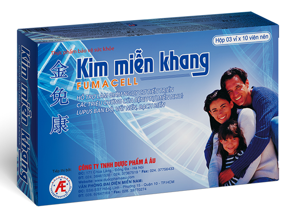 Thực phẩm bảo vệ sức khỏe Kim Miễn Khang - Dùng cho người bị bệnh tự miễn như lupus ban đỏ, vẩy nến, bạch biếnThực phẩm bảo vệ sức khỏe Kim Miễn Khang có thành phần bao gồm: Sói rừng, Nhàu, Nhũ hương, Hoàng bá, Thổ phục linh, L-Carnitine fumarate, Chiết xuất Nhũ Hương, Boron. ![]() Công dụng: ● Hỗ trợ tăng cường miễn dịch trong các bệnh tự miễn. ● Hỗ trợ làm giảm nguy cơ tiến triển các triệu chứng của bệnh tự miễn. Đối tượng sử dụng: Người bị bệnh tự miễn như: Lupus ban đỏ, bệnh bạch biến, bệnh vẩy nến. Hướng dẫn sử dụng: ● Ngày dùng 2 lần, mỗi lần 4-5 viên. ● Uống trước ăn 30 phút hoặc sau khi ăn 1 giờ. ● Nên dùng 1 đợt liên tục từ 03-06 tháng. Tiếp thị và phân phối bởi: Công ty TNHH Dược phẩm Á Âu Á Âu- Địa chỉ an tâm, tin cậy, chất lượng suốt 20 năm Địa chỉ: 171 Chùa Láng - Phường Láng Thượng - Quận Đống Đa - Hà Nội ĐT: 024.38461530 - 028.62647169 Số GPQC:1077/2020/ ATTP-XNQC *Thực phẩm này không phải là thuốc và không có tác dụng thay thế thuốc chữa bệnh. *Sản phẩm có bán tại các nhà thuốc trên toàn quốc. |