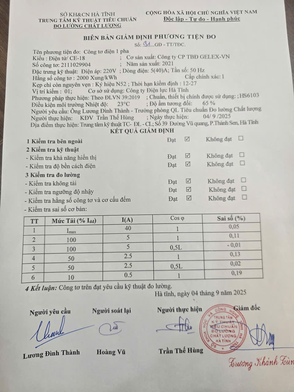 Ông Trương Khánh Tùng – Giám đốc Trung tâm Kỹ thuật Tiêu chuẩn Đo lường Chất lượng Hà Tĩnh cho biết: “Ngày 4/9, chúng tôi tiếp nhận 4 công tơ do Điện lực Hà Tĩnh tháo gửi để kiểm định. Kết quả cho thấy, 4 công tơ này đều đạt yêu cầu kỹ thuật, không phát hiện sai số, qua đó khẳng định các thiết bị được kiểm định hoạt động chính xác và có độ tin cậy cao.”