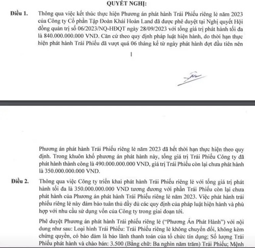 Đồng thời, HĐQT Khải Hoàn Land cũng thông qua việc triển khai phát hành trái phiếu riêng lẻ với tổng giá trị phát hành tối đa là 350 tỷ đồng, tương đương với phần trái phiếu còn lại của phương án phát hành trái phiếu riêng lẻ năm 2023 đã nêu trên. Cụ thể, trái phiếu thuộc loại hình trái phiếu riêng lẻ không chuyển đổi, không kèm chứng quyền, có bảo đảm là bảo lãnh thanh toán của tổ chức tín dụng.Số lượng trái phiếu phát hành và chào bán là 3.500 trái phiếu, mệnh giá 100 triệu đồng/trái phiếu, tổng giá trị phát hành 350 tỷ đồng.