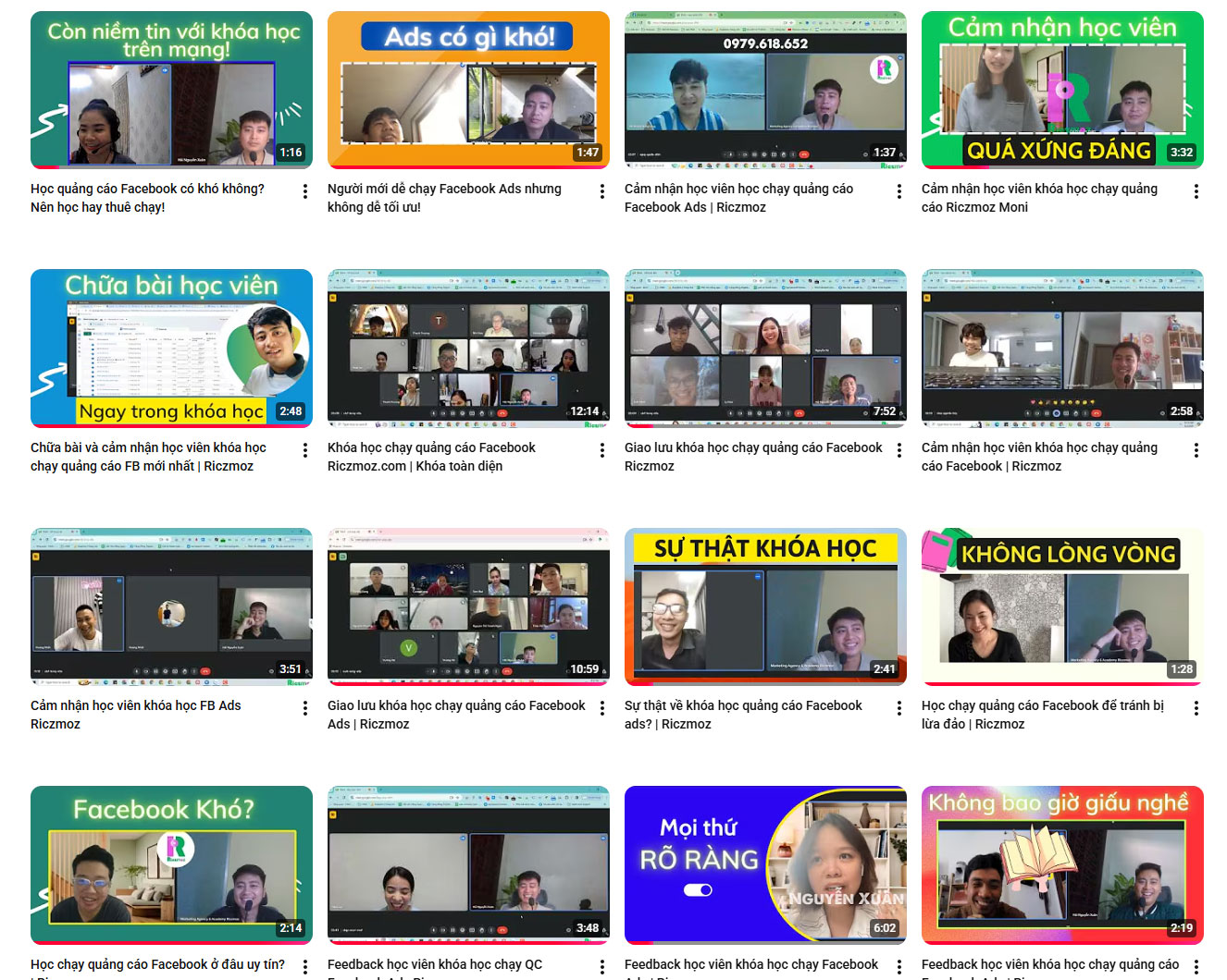 Không chỉ dừng lại ở việc đào tạo khóa học, Riczmoz còn duy trì một kênh YouTube Riczmoz Official với nhiều video hướng dẫn chuyên sâu về Facebook Ads, Google Ads và SEO. Đây là nơi cộng đồng marketer Việt có thể tiếp cận các kiến thức nâng cao, cập nhật xu hướng mới và quan trọng là xem trực tiếp feedback từ học viên thực tế đã tham gia các khóa học tại Riczmoz. Kênh YouTube này cũng là minh chứng rõ nhất cho tinh thần chia sẻ không giấu nghề của Tiha Nguyễn, nhưng vì công việc và lịch trình khá dày nên video sẽ không ra thường xuyên, mà tập trung cho việc dạy học viên đăng ký.