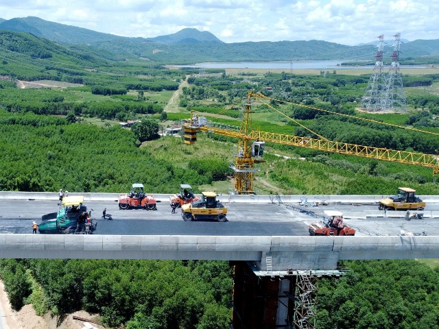 Những ngày này, 23 mũi thi công trải dọc tuyến đều hoạt động liên tục. Tiếng máy lu, xe rải nhựa, tiếng hô nhịp của công nhân hòa thành âm thanh rộn rã của “đại công trường” giai đoạn nước rút.