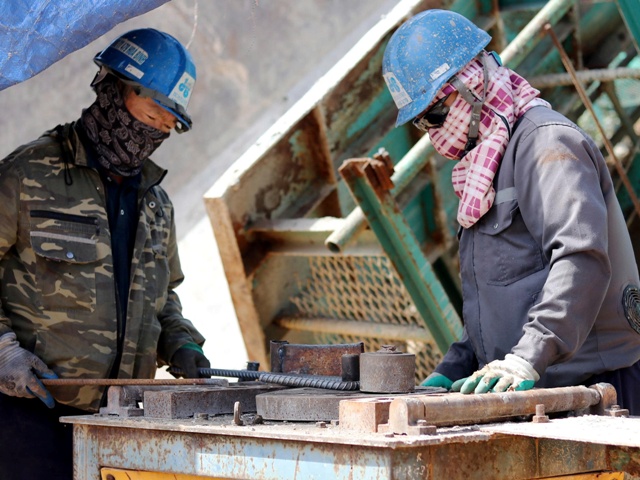 Vật liệu được vận chuyển không ngừng, máy móc làm việc hết công suất, tạo nên bầu không khí khẩn trương, hối hả.