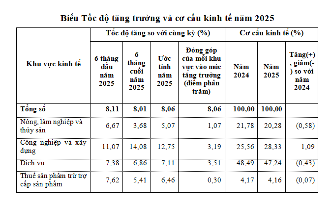 Trong cơ cấu tăng trưởng, khu vực nông, lâm nghiệp và thủy sản tăng 5,07%, đóng góp 1,07 điểm phần trăm; khu vực công nghiệp – xây dựng tăng 12,75%, đóng góp 3,19 điểm phần trăm; khu vực dịch vụ tăng 7,11%, đóng góp 3,51 điểm phần trăm; thuế sản phẩm trừ trợ cấp sản phẩm tăng 6,46%, đóng góp 0,30 điểm phần trăm vào mức tăng chung.