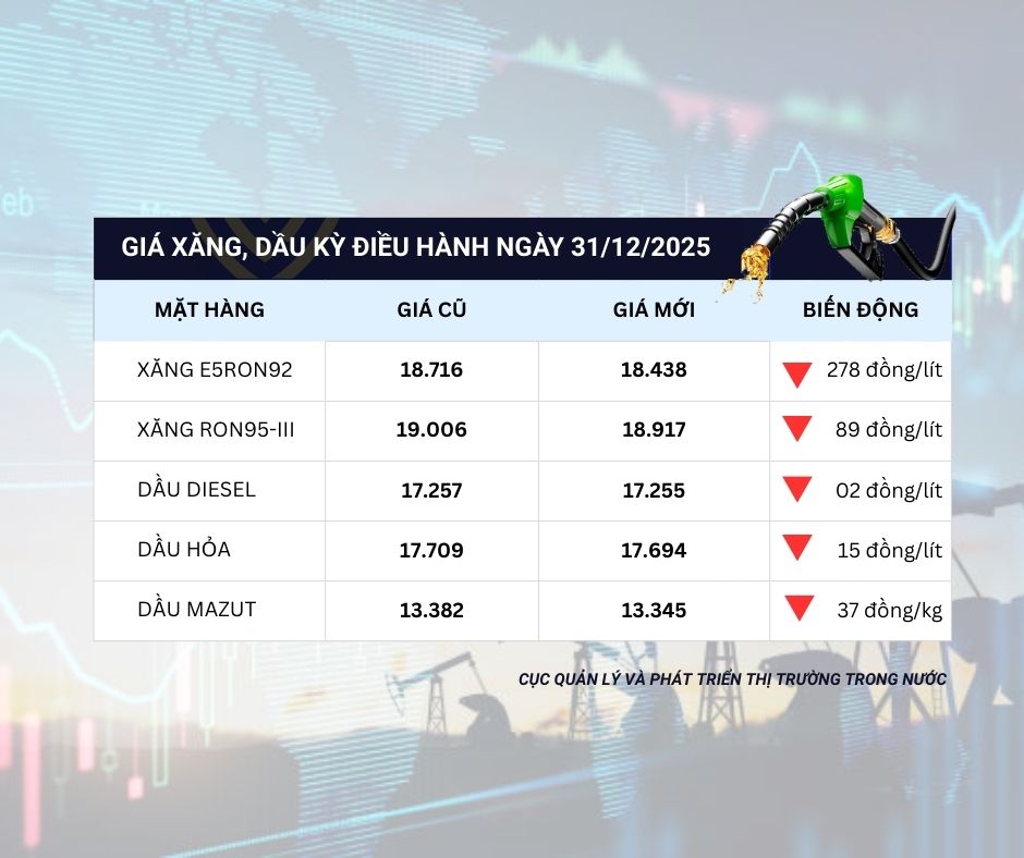 Bình quân giá thành phẩm xăng dầu thế giới giữa kỳ điều hành giá ngày 25/12/2025 và kỳ điều hành ngày 31/12/2025 là: 71,953 USD/thùng xăng RON92 dùng để pha chế xăng E5RON92 (giảm 1,471USD/thùng, tương đương giảm 2,00%); 73,980USD/thùng xăng RON95 (giảm 0,390 USD/thùng, tương đương giảm 0,52%); 81,893 USD/thùng dầu hỏa (giảm 0,015 USD/thùng, tương đương giảm 0,02%); 79,853 USD/thùng dầu điêzen 0,05S (tăng 0,059 USD/thùng, tương đương tăng 0,07%);341,763 USD/tấn dầu mazut 180CST 3,5S (giảm 1,011 USD/tấn, tương đương giảm 0,29%).