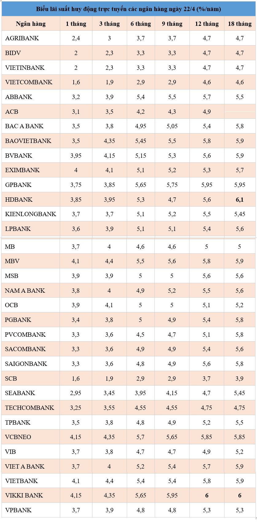 Theo thống kê, từ sau ngày 25/2 đã có 28 ngân hàng thương mại trong nước giảm lãi suất huy động với mức giảm từ 0,1-1,05%/năm. Riêng trong tháng 4/2025, có thêm một số ngân hàng giảm lãi suất huy động gồm VPBank, MB, Eximbank, Nam A Bank, OCB và GPBank. Bên cạnh việc giảm lãi suất huy động, GPBank và Eximbank cũng tăng lãi suất huy động một số kỳ hạn. Riêng OCB đã tăng lãi suất huy động trực tuyến tại tất cả kỳ hạn, ngoại trừ kỳ hạn 4 tháng.