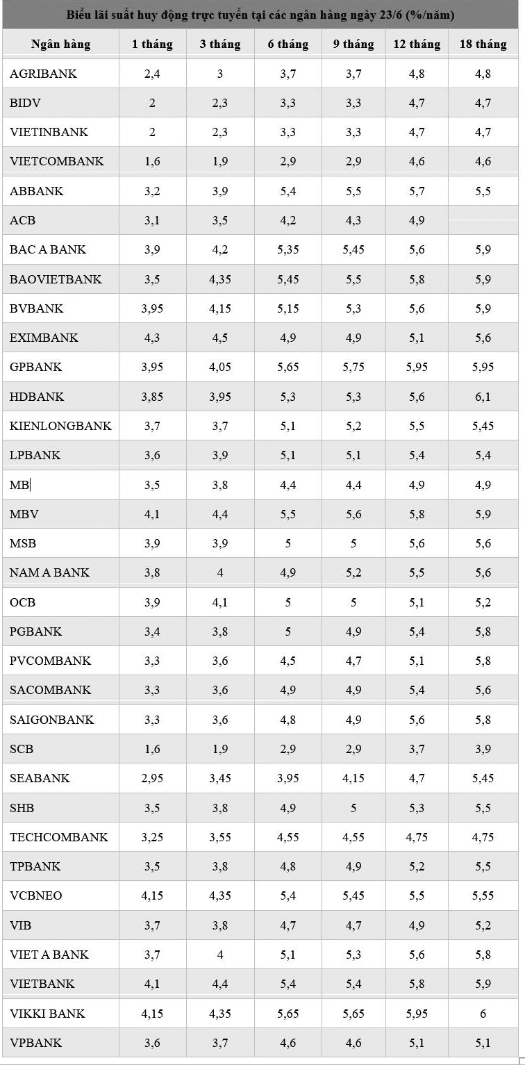 Lãi suất tiền gửi cao nhất 5,95%/năm được BVBank niêm yết cho tiền gửi trực tuyến kỳ hạn 24-36 tháng; GPBank niêm yết cho tiền gửi trực tuyến kỳ hạn 12-36 tháng. Ngoài ra, BaoViet Bank, MBV, VietBank và Bac A Bank cũng niêm yết lãi suất ngân hàng 5,9%/năm cho kỳ hạn từ 12-36 tháng.