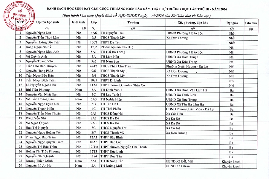 Với những kết quả tích cực, Cuộc thi “Sáng kiến phòng, chống bạo lực học đường” lần thứ III năm 2026 tiếp tục góp phần nâng cao nhận thức, trách nhiệm của học sinh và toàn ngành trong xây dựng môi trường giáo dục an toàn, thân thiện, tạo nền tảng vững chắc cho công tác phòng, chống bạo lực học đường trên địa bàn tỉnh.