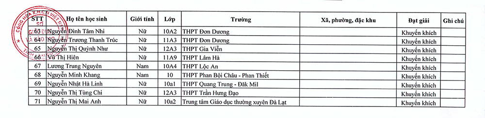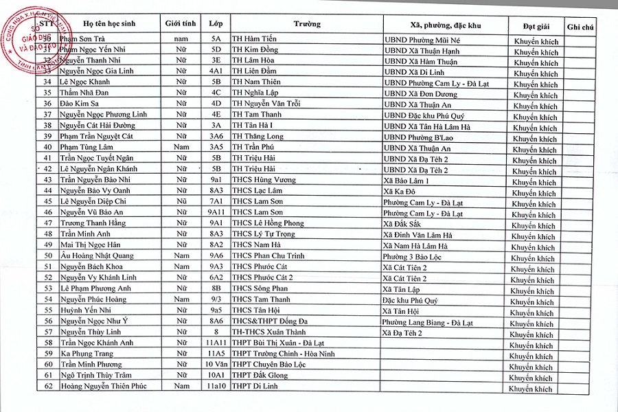 Căn cứ kết quả chấm thi, Sở Giáo dục và Đào tạo Lâm Đồng đã công nhận 71 học sinh đạt giải cấp tỉnh, đồng thời trao giấy chứng nhận và thực hiện khen thưởng theo quy định. Từ đó, 12 tác phẩm tiêu biểu đã được lựa chọn tham gia dự thi cấp Bộ.
