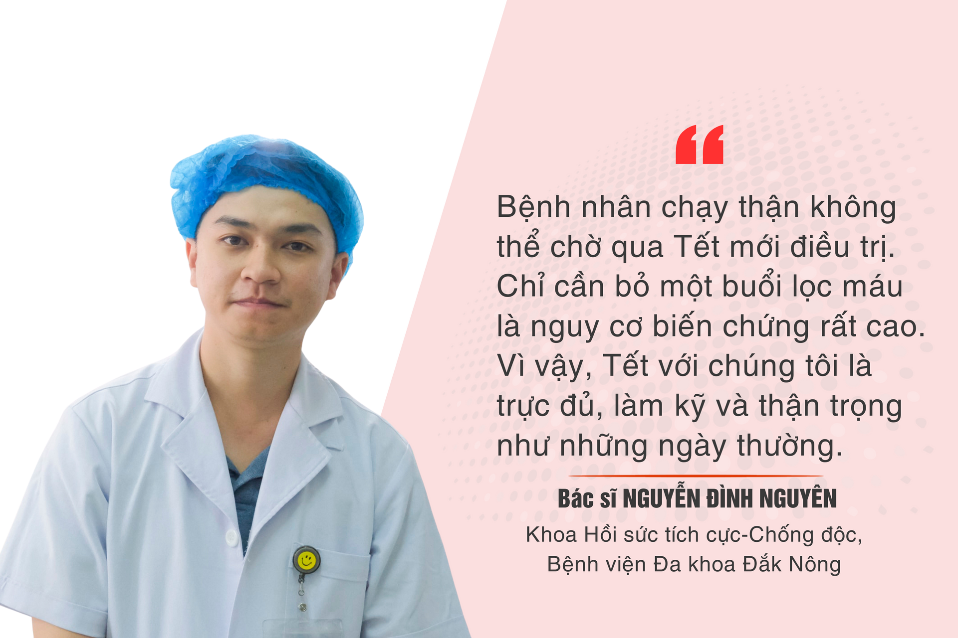 Trong khi bên ngoài, mọi người tất bật chuẩn bị đón năm mới, thì bên trong phòng chạy thận, tiếng máy lọc máu vẫn đều đặn vang lên. Bởi với bệnh nhân suy thận, việc điều trị không thể chờ đợi. Chỉ cần bỏ lỡ một lần lọc máu, nguy cơ biến chứng có thể xảy ra bất cứ lúc nào. Vì vậy, Tết với đội ngũ y bác sĩ là sự túc trực đầy đủ, làm việc nghiêm túc và trách nhiệm như những ngày thường – thậm chí còn áp lực hơn.