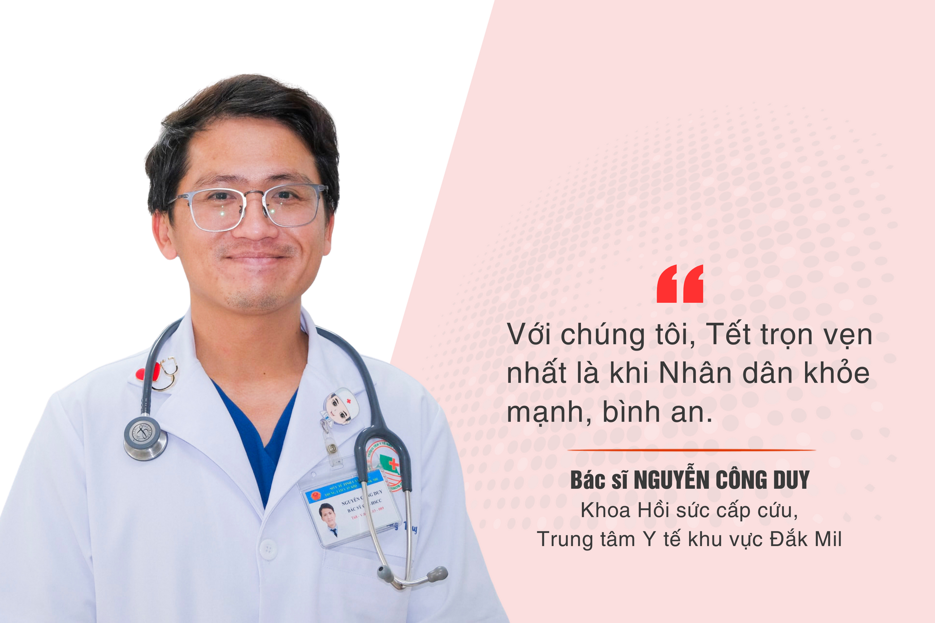 Với nhiều bác sĩ, hàng chục mùa xuân đã trôi qua trong bệnh viện. Họ quen với việc đón giao thừa giữa phòng cấp cứu, quen với những bữa cơm vội vàng bên hành lang bệnh viện. Và với họ, cái Tết ý nghĩa nhất chính là khi người dân được khỏe mạnh, bình an trở về nhà.