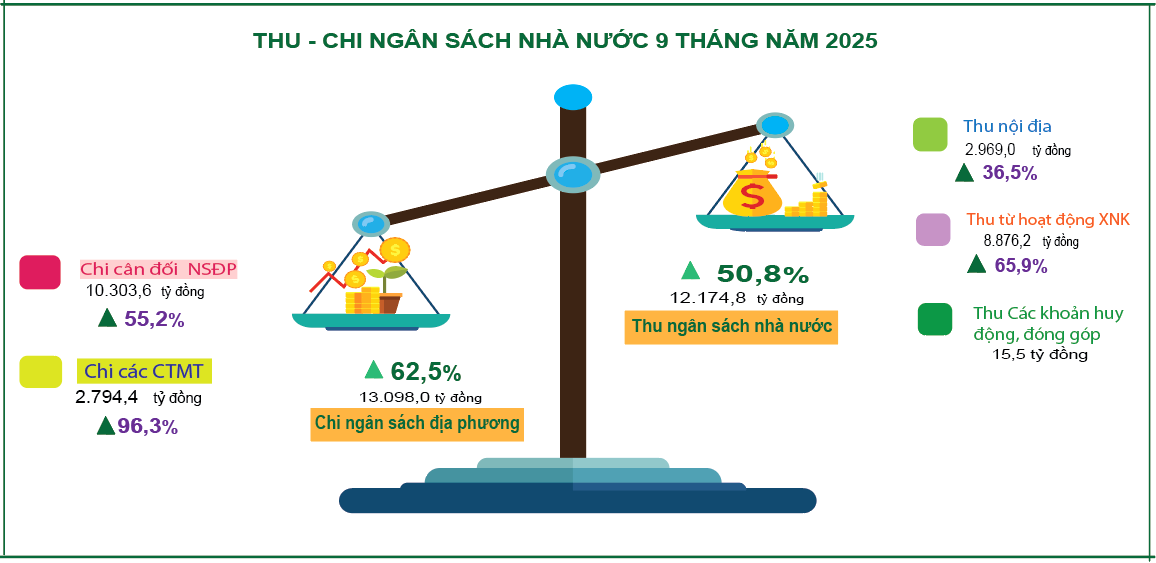 Ở chiều chi, ngân sách địa phương 9 tháng đạt 13.098 tỷ đồng, tăng 62,5% so với cùng kỳ, trong đó chi cân đối ngân sách 10.303 tỷ đồng, bảo đảm chi thường xuyên, an sinh xã hội và đầu tư phát triển.