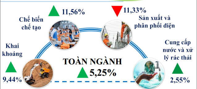 Ngành khai khoáng có sự phân hóa, tăng trưởng nhờ nhu cầu vật liệu xây dựng phục vụ các dự án hạ tầng, trong khi khai thác than giảm do nhu cầu tiêu thụ thấp. Ngành sản xuất và phân phối điện giảm nhẹ do điều chỉnh kế hoạch huy động nguồn điện.