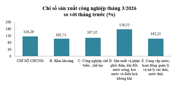 Tính chung quý I, chỉ số sản xuất công nghiệp tăng 5,25% so với cùng kỳ. Trong đó, ngành chế biến, chế tạo tăng 11,56%, tiếp tục là động lực chính với nhiều ngành tăng trưởng mạnh như sản xuất sản phẩm cao su, phương tiện vận tải, vật liệu xây dựng và chế biến thực phẩm.