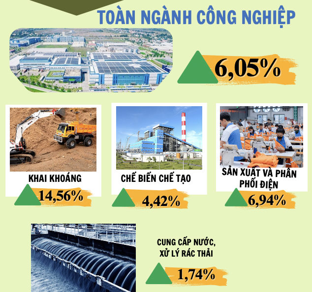 Tuy vậy, một số ngành công nghiệp chủ lực vẫn duy trì mức tăng trưởng khả quan: Công nghiệp chế biến, chế tạo tăng 1,67%; cung cấp nước, quản lý và xử lý rác thải, nước thải tăng 0,67%. Đáng chú ý, nhóm sản xuất kim loại tăng mạnh 191,46%; sản xuất trang phục tăng 7,61%; sản xuất điện tử, máy vi tính và quang học tăng 7,14% nhờ các doanh nghiệp nhận thêm đơn hàng.