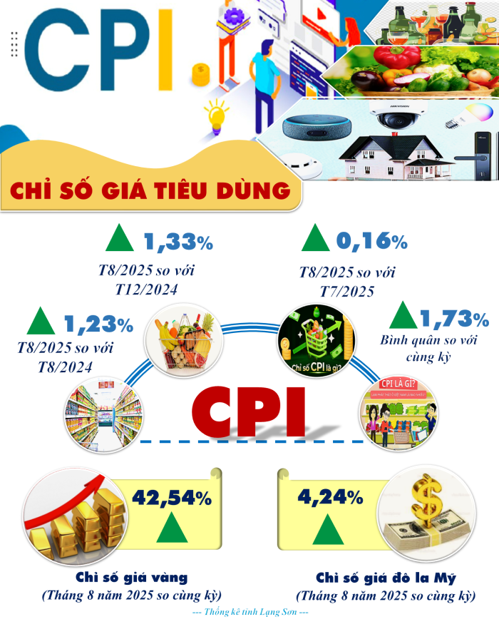 Chỉ số giá tiêu dùng (CPI) tháng 8/2025 tăng 0,16% so với tháng trước và 1,23% so với cùng kỳ, duy trì mức ổn định. Nhóm hàng ăn, thực phẩm, nhà ở, vật liệu xây dựng, thuốc và dịch vụ y tế đều tăng nhẹ. Riêng nhóm giáo dục giảm mạnh do tác động điều chỉnh giá theo lộ trình.