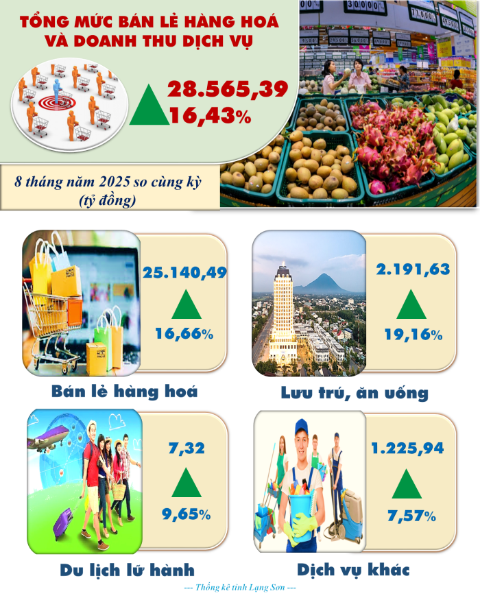 Bức tranh kinh tế - xã hội tháng 8 và 8 tháng đầu năm 2025 của tỉnh Lạng Sơn cho thấy nhiều gam màu sáng: công nghiệp chế biến – chế tạo duy trì tăng trưởng, bán lẻ và dịch vụ phục hồi mạnh, vận tải – logistics mở rộng, thu ngân sách vượt tiến độ, đầu tư công được đẩy mạnh.