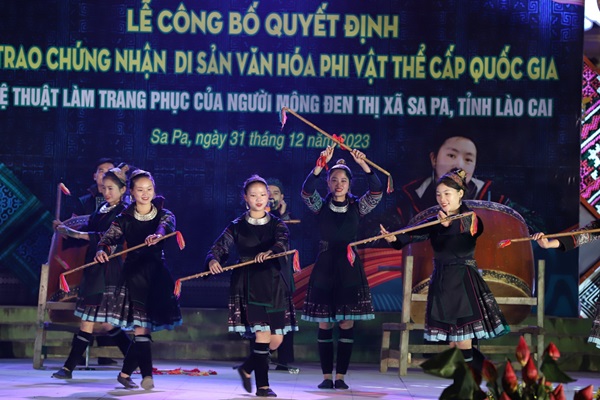 Mở đầu Chương trình chào năm mới Xuân Giáp Thìn 2024 là Lễ công bố, đón nhận Bằng Di sản văn hóa phi vật thể quốc gia về “Nghệ thuật làm trang phục của người Mông đen thị xã Sa Pa. Đây là niềm vinh dự to lớn đối với nhân dân các dân tộc thị xã Sa Pa, khẳng định sức sống trường tồn trong dòng chảy văn hóa các dân tộc đồng thời thể hiện đóng góp to lớn của văn hóa các dân tộc trong việc tạo điểm nhấn và thu hút khách du lịch đến với Sa Pa.