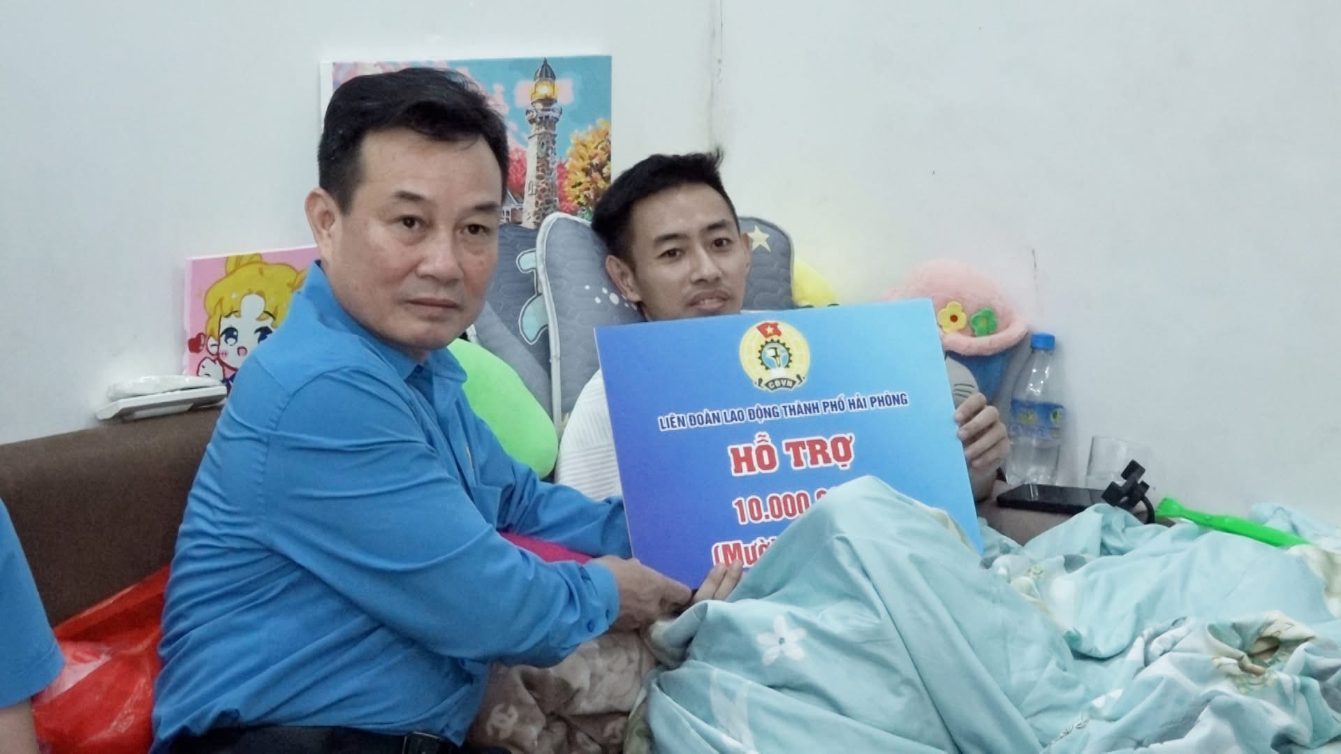 Ông Nguyễn Văn Phiệt – Phó Chủ tịch Liên đoàn Lao động thành phố trao số tiền 10 triệu đồng từ nguồn kinh phí của Liên đoàn Lao động thành phố; bà Đỗ Thị Ngần – Chủ tịch Công đoàn phường trao quà của Công đoàn phường cho đoàn viên Vũ Anh Tuấn.