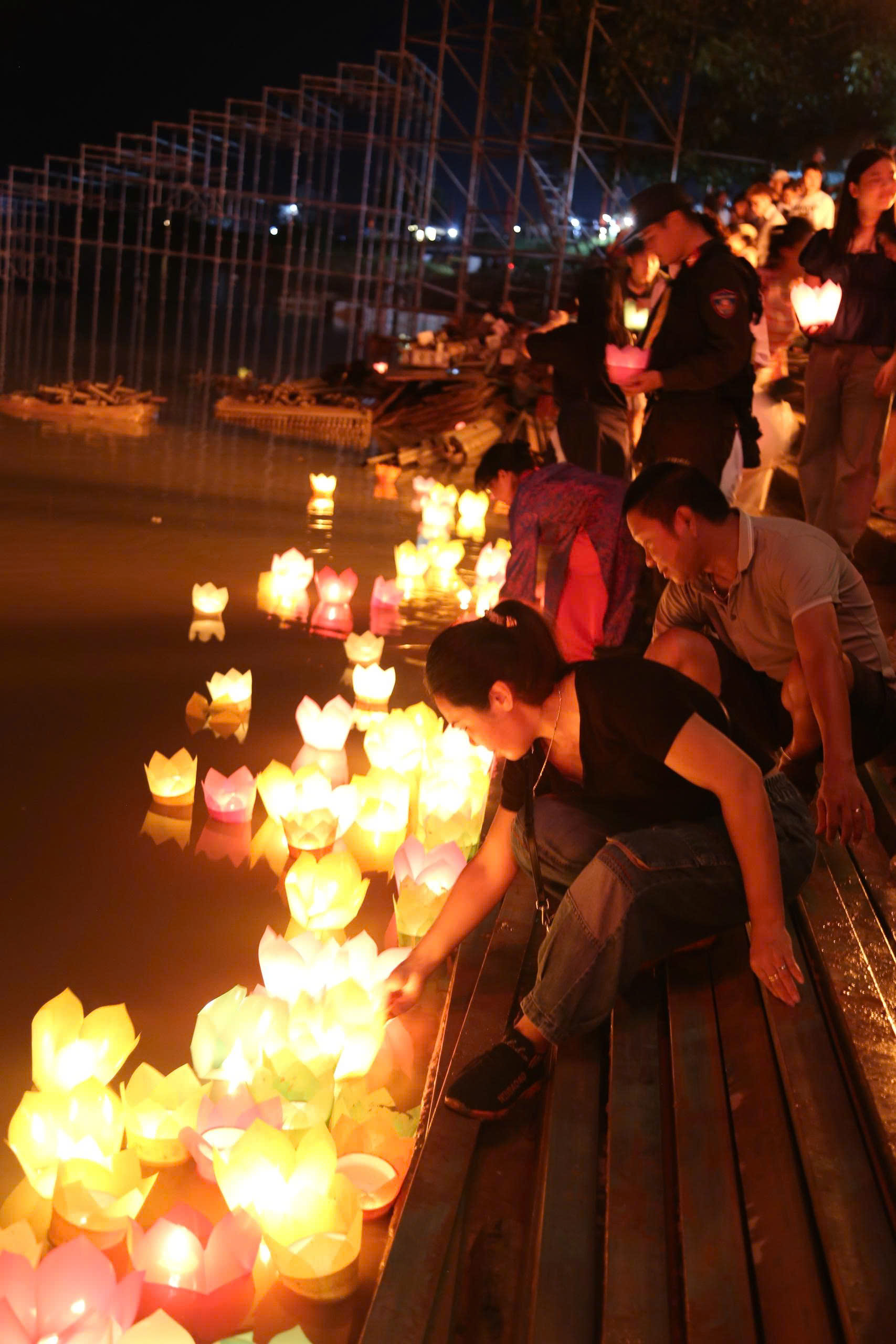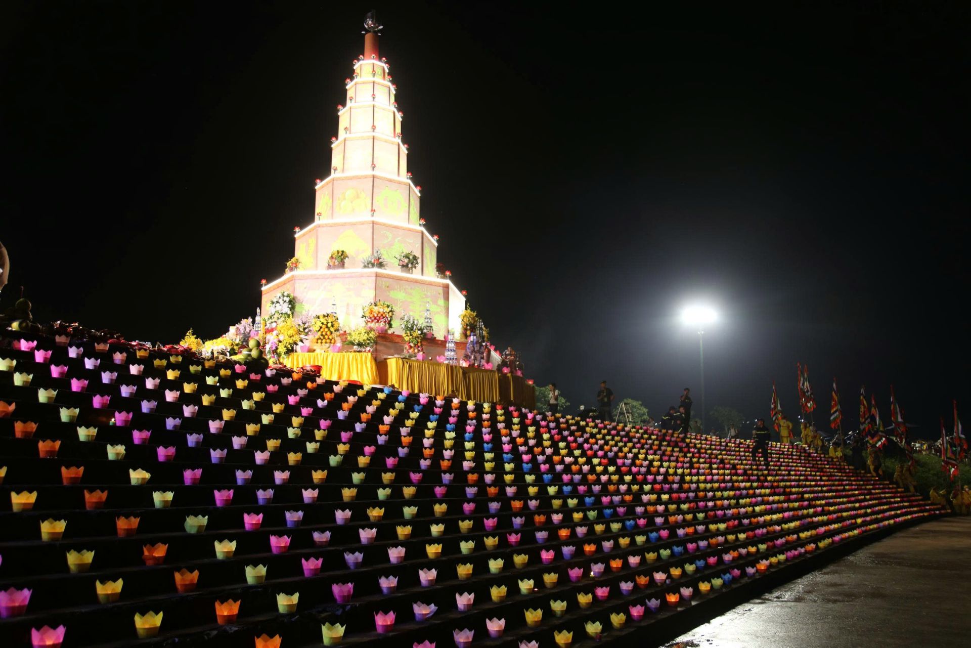 Trên bộ, 9 tầng tháp tượng trưng cho trục nối, giao thoa trời - đất, âm - dương. 9 tầng hoa văn đặc trưng của Đạo - Phật - Nho đan xen tạo nên một bức tranh đa sắc màu lộng lẫy tựa như tháp pha lê nguy nga trong đêm hội. Sợi dây trắng, hồng nối từ tháp xuống sông, tượng trưng cho Cầu Siêu Thoát. Dưới sông, từng đoàn thuyền chở đầy ắp hoa đăng, lung linh, bừng sáng cả góc trời Vạn Kiếp. Những cánh hoa rực rỡ chở tình cảm tri ân của thế hệ hôm nay gửi gắm về cõi xa xăm, không phải ngẫu nhiên tụ hội quanh Cồn Kiếm (dải đất hình thanh kiếm của Trần Hưng Đạo giữa sông Lục Đầu) tạo thành Thanh kiếm lửa - Đó là sự linh ứng, siêu thoát của các vong hồn… Trên không, pháo bông, đèn trời rực rỡ… Tất cả ngập tràn trong không khí thiêng liêng, huyền ảo. Một cảm giác nhẹ nhàng, phấn chấn và siêu thoát thực sự choáng ngợp…đọng lại trong lòng mỗi người sự biết ơn, niềm kiêu hãnh, tự hào. Nghi lễ đã để lại ấn tượng đẹp trong lòng du khách.