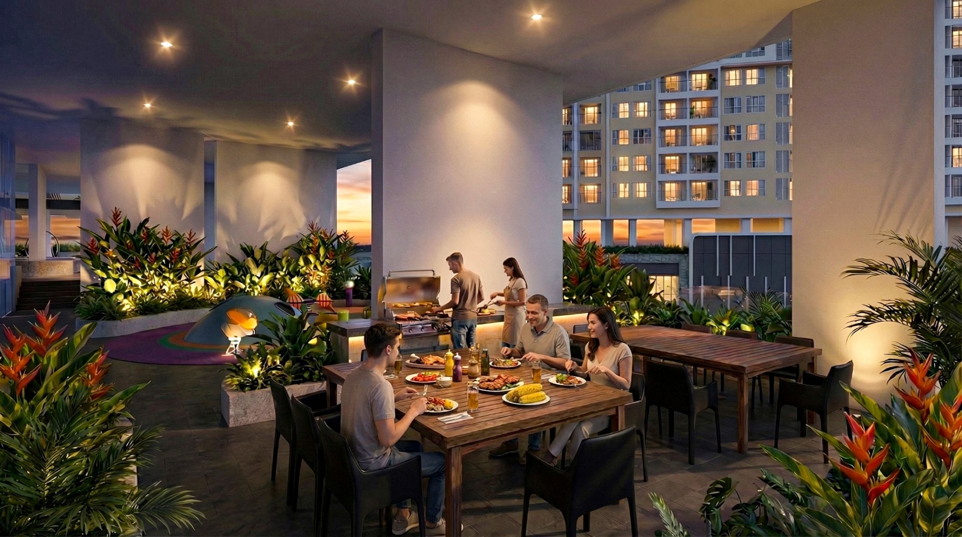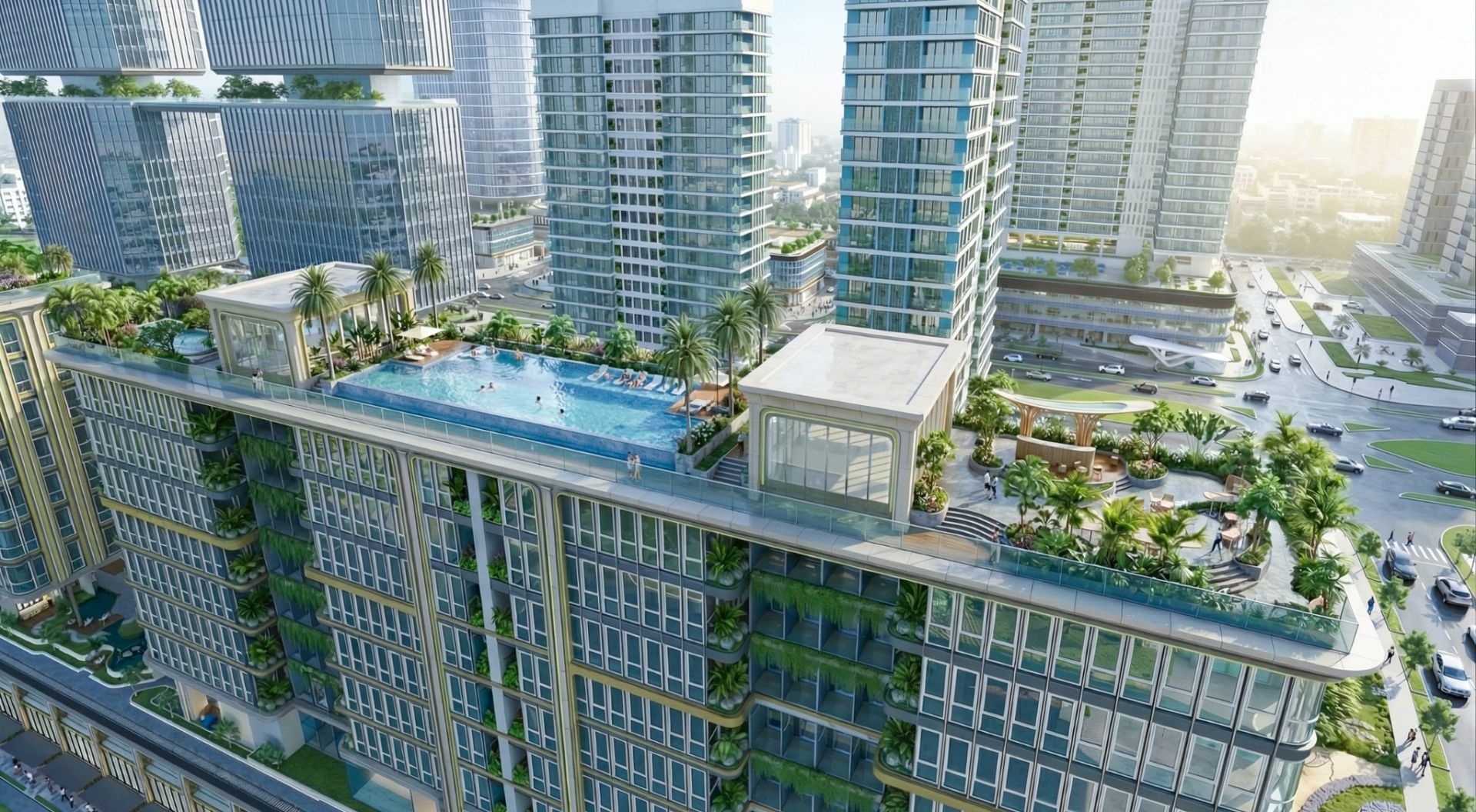 Điểm nhấn của dự án là tầng tiện ích E-Deck, được thiết kế như một “resort trên cao”, tích hợp hồ bơi trung tâm, khu lounge, dining, gym – wellness – sauna cùng hệ thống cảnh quan xanh. Không gian này không chỉ phục vụ nhu cầu sinh hoạt mà còn hướng đến trải nghiệm nghỉ dưỡng, tái tạo năng lượng ngay trong nội khu, góp phần nâng cao chất lượng sống hàng ngày cho cư dân.