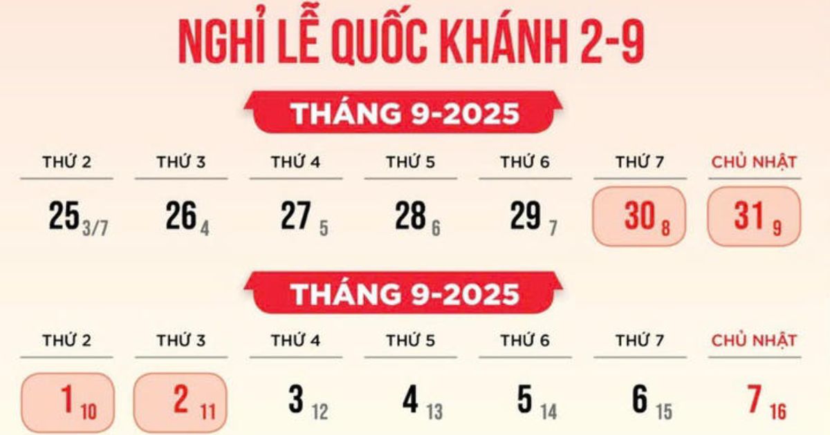 Theo đó, cán bộ, công chức, viên chức và người lao động của các cơ quan hành chính, sự nghiệp, tổ chức chính trị, tổ chức chính trị - xã hội được nghỉ dịp lễ Quốc khánh năm 2025 từ thứ Bảy ngày 30/8/2025 đến hết thứ Ba ngày 2/9/2025 Dương lịch (bao gồm 02 ngày nghỉ lễ Quốc khánh và 02 ngày nghỉ hằng tuần).