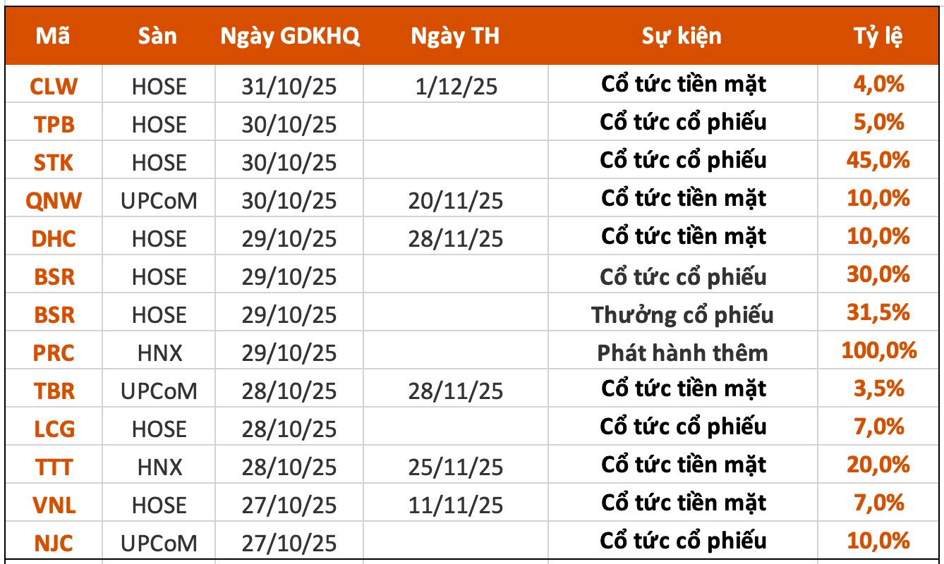 Theo thống kê, có 13 doanh nghiệp thông báo chốt quyền cổ tức trong tuần 27/10-31/10. Trong đó, 6 doanh nghiệp trả cổ tức bằng tiền mặt trong tuần này, mức cao nhất là 20% và thấp nhất là 3,5%. Ngoài ra có 5 doanh nghiệp trả cổ tức cổ phiếu, 1 doanh nghiệp phát hành thêm, 1 doanh nghiệp thưởng cổ phiếu trong tuần này.