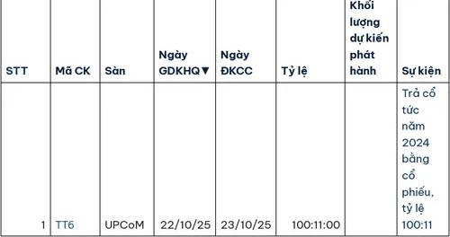 Ngoài ra, cũng trong thời gian này, cũng có 1 doanh nghiệp chốt quyền trả cổ tức bằng cổ phiếu.