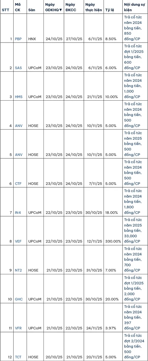 Trong tuần tới từ ngày 20-24/10, có 12 doanh nghiệp chốt quyền trả cổ tức bằng tiền, trong đó CTCP Trung tâm Hội chợ Triển lãm Việt Nam(mã CK: VEF) trả cổ tức cao nhất 330% (1 cổ phiếu được nhận 33.000 đồng). Trong khi đó CTCP Vận tải và Thuê tàu (mã chứng khoán VFR) trả cổ tức thấp nhất 3,97% (1 cổ phiếu được nhận 397 đồng).