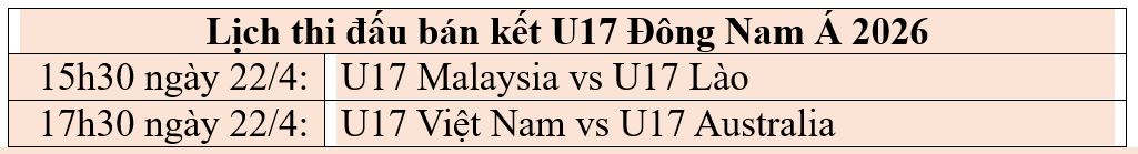 Theo lịch thi đấu do ban tổ chức công bố, cả hai trận bán kết U17 Đông Nam Á 2026 đều diễn ra trong ngày 22/4. Cụ thể, trận đấu giữa U17 Malaysia và U17 Lào diễn ra lúc 15h30, trong khi U17 Việt Nam sẽ đối đầu U17 Australia vào lúc 17h30 cùng ngày. Hai đội giành chiến thắng sẽ bước vào trận chung kết tranh ngôi vô địch.
