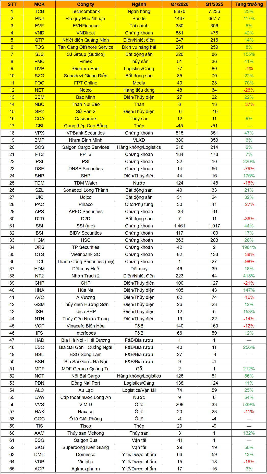 Trong khi đó, CTCP Vàng bạc Đá quý Phú Nhuận (PNJ) công bố doanh thu thuần quý I/2026 đạt 17.245 tỷ đồng, tăng 79% so với cùng kỳ. Lợi nhuận sau thuế đạt 1.467 tỷ đồng, cao hơn gấp đôi so với cùng kỳ năm trước, qua đó hoàn thành khoảng 43% kế hoạch lợi nhuận năm.