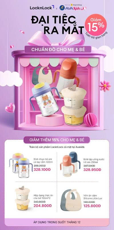 Chào mừng sự kiện ra mắt đặc biệt, LocknLock và Avakids giới thiệu chương trình “Đại Tiệc Ra Mắt – Chuẩn Đồ Cho Mẹ Và Bé” với chuỗi ưu đãi kéo dài xuyên suốt tháng 12, từ ngày 8/12 đến 31/12/2025. Khách hàng có thể thoải mái lựa chọn các sản phẩm LocknLock Mẹ & Bé với ưu đãi giảm 15% tại toàn bộ cửa hàng Avakids trên toàn quốc cũng như trên website https://www.avakids.com/locknlock, giúp phụ huynh thuận tiện hơn khi chọn mua sản phẩm an toàn, chất lượng cho bé.