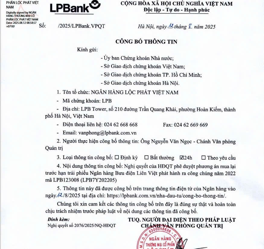 Hội đồng quản trị LPBank đã phê duyệt phương án mua lại toàn bộ lô trái phiếu mã LPB123008 trước hạn. Theo kế hoạch, vào ngày 15/9 tới, ngân hàng sẽ chi khoảng 2.125,4 tỷ đồng để tất toán toàn bộ 21,25 triệu trái phiếu đang lưu hành của lô này. Đây là lô trái phiếu có kỳ hạn 7 năm, phát hành từ tháng 9/2023, và việc mua lại chỉ sau 2 năm cho thấy LPBank đang linh hoạt tái cơ cấu các khoản nợ nhằm tối ưu hóa hiệu quả sử dụng vốn.